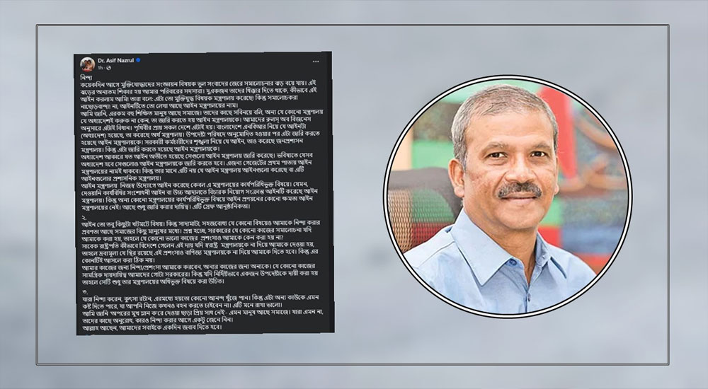 অনলাইন ডেস্ক: দায়িত্ব পালন করতে গিয়ে বারবার অযাচিত সমালোচনার মুখে পড়ছেন বলে জানিয়েছেন আইন উপদেষ্টা অধ্যাপক ড. আসিফ নজরুল। এ নিয়ে সামাজিক যোগাযোগমাধ্যমে ক্ষোভ প্রকাশ করেছেন তিনি। বুধবার (১১ জুন) নিজের ভেরিফায়েড ফেসবুক আইডিতে দেওয়া এক পোস্টে তিনি জানান, আল্লাহ আছেন, আমাদের সবাইকে একদিন জবাব দিতে হবে।