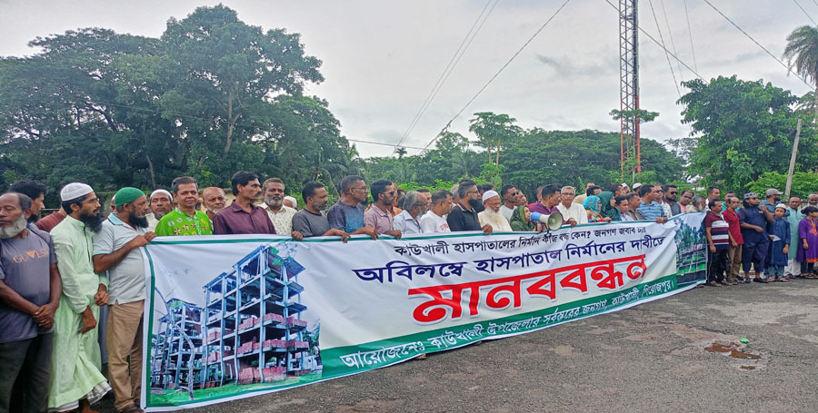 কাউখালী(পিরোজপুর)সংবাদদাতা-কাউখালী উপজেলা স্বাস্থ্য কমপ্লেক্সের নির্মাণ কাজ ১৭ বছরেও শেষ না হওয়ায় ভবন নির্মাণের দাবিতে মানববন্ধন করেছে এলাকাবাসী। বুধবার (৪ জুন) বেলা ১১টায় নির্মাণাধীন স্বাস্থ্য কমপ্লেক্সের সামনের সড়কে ঘন্টাব্যাপী এ মানববন্ধন অনুষ্ঠিত হয়। মানববন্ধনে চিকিৎসক, সাংবাদিক, রাজনৈতিক নেতৃবৃন্দসহ বিভিন্ন শ্রেণি-পেশার মানুষ অংশ গ্রহন করে।
