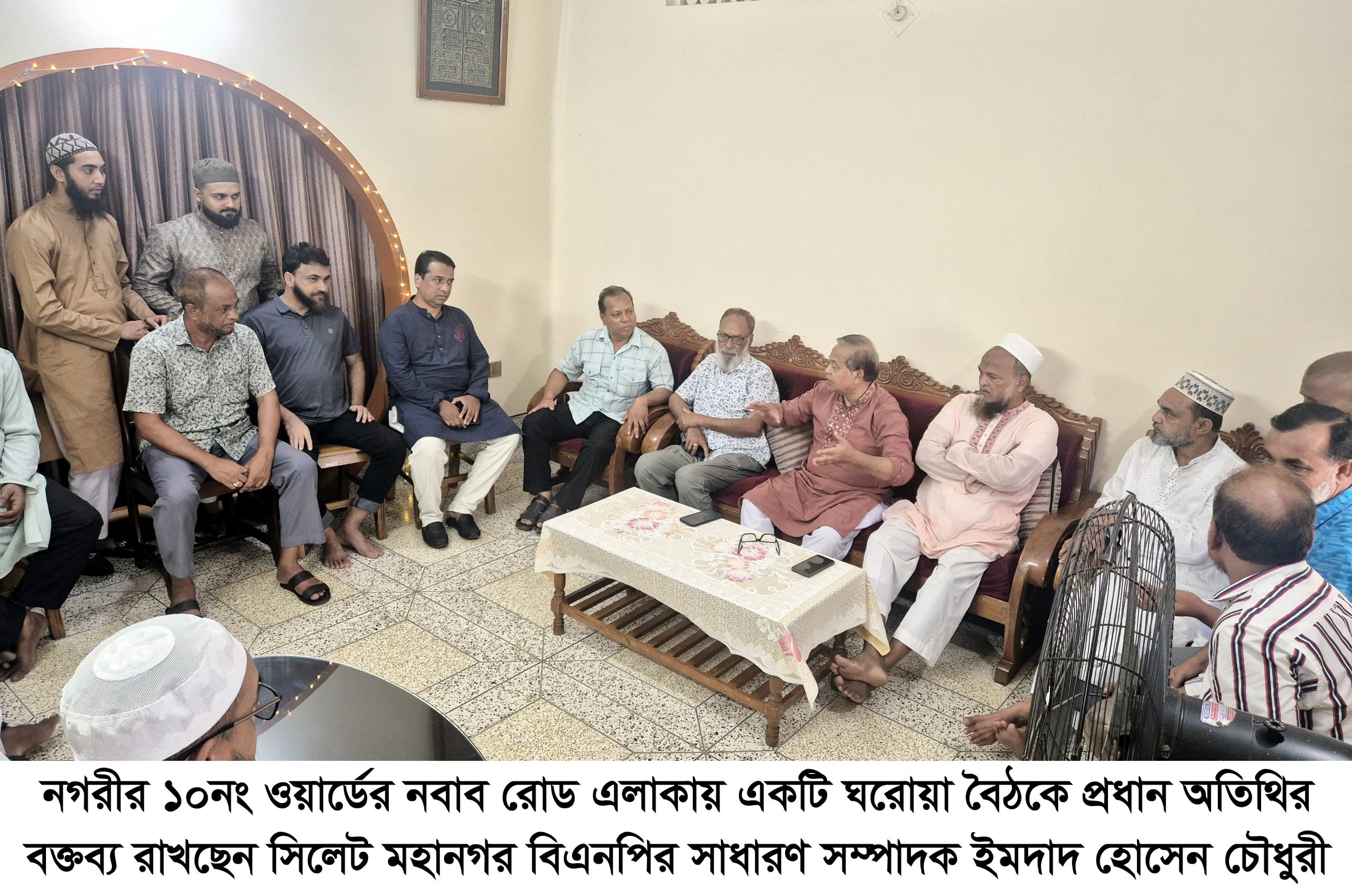 বৃহস্পতিবার (২৪ জুলাই) নগরীর ১০নং ওয়ার্ডের নবাব রোড এলাকায় একটি ঘরোয়া বৈঠকে প্রধান অতিথির বক্তব্যে তিনি উপরোক্ত কথাগুলো বলেন।এসময় অন্যান্যের মধ্যে উপস্থিত ছিলেন, মহানগর বিএনপির সহ সভাপতি ও ১০ নং ওয়ার্ড সভাপতি আব্দুল হাকিম, ১০নং ওয়ার্ড বিএনপি সাবেক সভাপতি সাইদুর রহমান বুদুরী, বিএনপি নেতা হাজি সোহেল আহমদ, বিশিষ্ট ব্যাবসায়ি ও বিএনপি নেতা হাজি আহমদ হোসেন, বিশিষ্ট ব্যাবসায়ি হাজি আব্দুল মুকতাদির, ১০নং ওয়ার্ড বিএনপি সহ সভাপতি সেলিম আহমদ মাহমুদ, সাংগঠনিক সম্পাদক নাছির উদ্দীন রব, সহ সাধারণ সম্পাদক আবুল কালাম আজাদ, ১২নং ওয়ার্ড বিএনপি সহ সাধারণ সম্পাদক মারুফ আহমদ টিপু, সবুজ সেনা যুব সংঘ সভাপতি বিএনপি নেতা রিয়াজ উদদীন বাদশা, সিটি সুপার মার্কেট ব্যাবসায়ি সমিতি সেক্রেটারি বিএনপি নেতা আতাউর রহমান রজব, বিএন পিনেতা নজরুল ইসলাম, বিএনপি নেতা আল আমিন, বিশিষ্ট ব্যবসায়ি আব্দুল করিম, বিশিষ্ট ব্যাবসায়ি আজিম আহমদ, বিএনপি নেতা মোর্শেদ আহমদ, তানভীর আহমদ, হাজি আলী আহমদ পুলক প্রমুখ। বিজ্ঞপ্তি