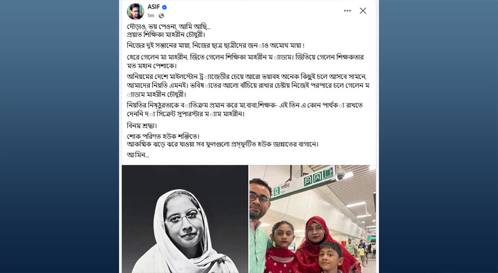 পোস্ট দিয়ে আসিফ আকবর লিখেছেন, ‘ ‘দৌড়াও, ভয় পেওনা আমি আছি।’ প্রয়াত শিক্ষিকা মাহেরীর চৌধুরী নিজের দুই সন্তানের মায়া, নিজের ছাত্র ছাত্রীদের জন্যও অমোঘ মায়া। হেরে গেলেন মা মাহেরীন, জিতে গেলেন শিক্ষিকা মাহেরীন ম্যাডাম।’