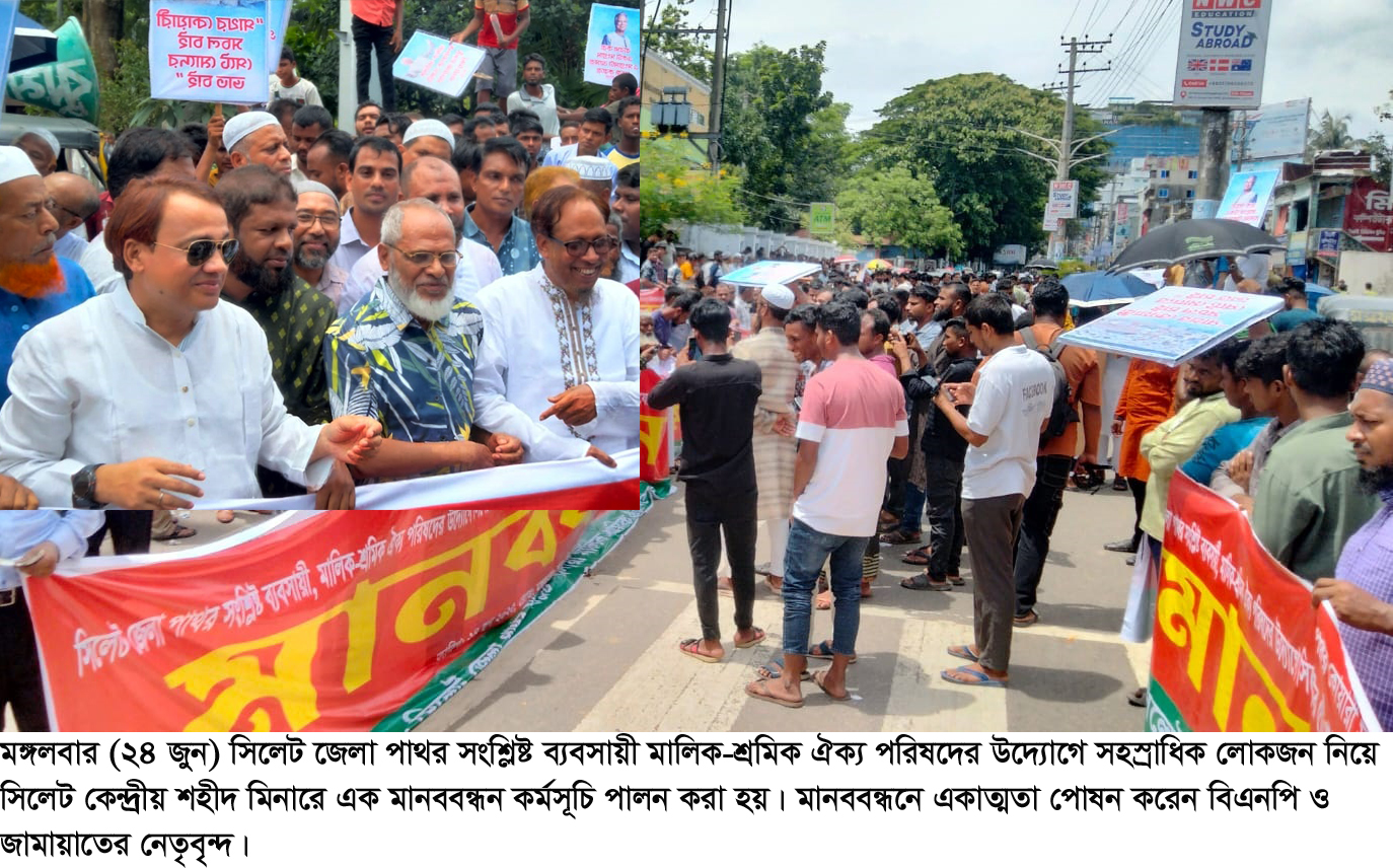 সিলেট বিভাগের ইজারা স্থগিতকৃত ৫টি পাথর কোয়ারী খুলে দেওয়ার দাবিতে এবং ট্রাক শ্রমিকদের গাড়ি তল্লাশির নামে হয়রানি ও সিলেটের ক্রাশার মিল মালিকদের হয়রানি বন্ধ, ব্যবসার সুবর্ণ সুযোগ দিতে এবং বিদ্যুৎ এর মিটার পুণরায় ফেরত দেয়ার দাবীতে এক বিশাল মানববন্ধন এবং বিক্ষোভ সমাবেশ অনুষ্ঠিত হয়। সিলেট জেলা পাথর সংশ্লিষ্ট ব্যবসায়ী মালিক-শ্রমিক ঐক্য পরিষদের আহবায়ক আব্দুল জলিল মেম্বারের সভাপতিত্ত্বে ও ঐক্য পরিষদের সম্বন্নয়ক শাব্বীর আহমদ ফয়েজের পরিচালনায় অনুষ্ঠিত মানববন্ধন ও প্রতিবাদ সভায় সংহতি জানিয়ে বক্তব্য রাখেন সিলেট মহানগর বিএনপির ভারপ্রাপ্ত সভাপতি রেজাউল হাসান কয়েস লোদি, সাধারণ সম্পাদক এমদাদ হোসেন চৌধুরী, সহ সভাপতি সাদিকুর রহমান সাদিক, সিলেট জেলা জামায়াতে ইসলামীর সেক্রেটারী ও সাবেক উপজেলা চেয়ারম্যান জয়নাল আবেদীন, মহানগর জামায়াতে ইসলামীর আমীর ফখরুল ইসলাম, সিলেট জেলা ট্রাক মালিক গ্রুপের ভারপ্রাপ্ত সভাপতি নাজির আহমদ স্বপন, সাধারণ সম্পাদক নুর আহমদ খান সাদেক, জাতীয় নাগরিক পার্টির সিলেট জেলার আহবায়ক জনাব নাজিম উদ্দিন সাহান, যুগ্ম আহবায়ক মেজর আজিজ, মহানগর এসসিপির আহবায়ক আবু সাদেক মোহাম্মদ খায়রুল ইসলাম চৌধুরী, সিলেট জেলা বাস মিনিবাস কোচ মাইক্রোবাস মালিক সমিতির যুগ্ম সাধারণ সম্পাদক তারেক আহমদ, ইসলামী আন্দোলন সিলেট জেলার সাংগঠনিক সম্পাদক অধ্যক্ষ রুহুল আমীন, সিলেট জেলা ট্রাক পিকআপ কাভার্ডভ্যান শ্রমিক ইউনিয়নের সভাপতি মোঃ দিলু মিয়া, কার্যকরি সভাপতি আব্দুস সালাম, সাধারণ সম্পাদক আব্দুল গফুর, যুগ্ম সাধারণ সম্পাদক আহমদ আলী স্বপন, কোষাধ্যক্ষ জুরহাস হোসেন বাদল, নির্বহী সদস্য আলী আহমদ, দফতর সম্পাদক বিলাল হোসেন, সিলেট জেলা ট্রাক মালিক গ্রুপের সহ সভাপতি আতিকুর রহমান, সহ সভাপতি মুজিবুর রহমান, সহ সভাপতি সুহেল রানা, নারায়ন পুকায়স্থ ফনি, কয়ছর আলী জালালী, মানছুর আলম, জাকির হোসেন তালুকদার, ফখর উদ্দিন, সিলেট জেলা পাথর সংশ্লিষ্ট ব্যবসায়ী মালিক-শ্রমিক ঐক্য পরিষদের যুগ্ম আবহায়ক শওকত আলী বাবুল, জাফলং বল্লাঘাট ষ্টোন ক্রাশার পাথর মিল মালিক সমিতির সাধারণ সম্পাদক শামীম পারভেজ, ইয়াসীন আলী, সিলেট সদর পাথর বালি ও ষ্টোন ক্রাশার মালিক সমবায় সমিতির মোঃ মন্তাজ আলী, নাজিম উদ্দিন ইমরান মেম্বার, জয়নুল হক, মোজাম্মেল আলী সাদ্দাম, আব্দুল হক, সালুটিকর পাথর ব্যবসায়ী সমবায় সমিতির সভাপতি মোঃ দিলু মিয়া, সিলেট জেলা বাস মিনিবাস শ্রমিক ইউনিয়নের যুগ্ম সাধারণ সম্পাদক আলী আকবর রাজন, জাফলং ট্রাক শ্রমিক ইউনিয়নের সভাপতি ছমেদ মিয়া, শাহপরান থানা ট্রাক শ্রমিক ইউনিয়নের সভাপতি ফুল মিয়া, সাধারণ সম্পাদক মোঃ বাবলা আহমদ, ক্রাশার ািমল মালিক সাধার সম্পাদক আব্দু