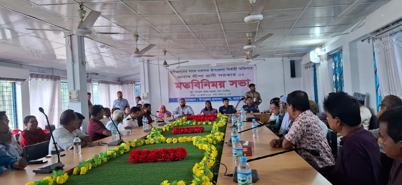 সভায় সভাপতিত্ব ও স্বাগত বক্তব্য দেন তালা উপজেলার নবাগত নির্বাহী কর্মকর্তা ও উপজেলা পরিষদের প্রশাসক দীপা রানী সরকার। উপজেলা সহকারী কমিশনার (ভূমি) মাসুদুর রহমানের সঞ্চালনায় সভায় বক্তব্য রাখেন তালা থানার অফিসার ইনচার্জ মো. মাইনউদ্দিন, পাটকেলঘাটা থানার অফিসার ইনচার্জ শেখ শাহিনুর রহমান, উপজেলা মহিলা বিষয়ক কর্মকর্তা নাজমুন নাহার, উপজেলা কৃষি কর্মকর্তা হাজিরা খাতুন, তালা উপজেলা বিএনপির সভাপতি মৃণাল কান্তি রায়, সাতক্ষীরা জেলার নায়েবে আমীর ডা. মাহমুদুল হক, জামায়াতে ইসলামীর তালা উপজেলার আমীর মাওলানা মফিদুল ইসলাম, তালা মহিলা কলেজের ভারপ্রাপ্ত অধ্যক্ষ শেখ শফিকুল ইসলাম, জালালপুর ইউপি চেয়ারম্যান এম মফিজুল হক লিটু, ধানদিয়া ইউপি চেয়ারম্যান জাহাঙ্গীর আলম, ইসলামকাটি ইউপি চেয়ারম্যান গোলাম ফারুক, খেশরা ইউপি চেয়ারম্যান কামরুল ইসলাম লাল্টু, উপজেলা বিএনপির যুগ্ম সম্পাদক অধ্যাপক মোশাররফ হোসেন, উপজেলা নাগরিক কমিটির সাধারণ সম্পাদক শফিকুল ইসলাম, তালা প্রেসক্লাবের সভাপতি এস এম হাকিম, পাটকেলঘাটা প্রেসক্লাবের সভাপতি আব্দুল মোমিন, তালা প্রেসক্লাবের সাধারণ সম্পাদক ফারুক হোসেন, যুবদলের যুগ্ম আহ্বায়ক সাইদুর রহমান সাঈদ, তালা বাজার বণিক সমিতির যুগ্ম আহ্বায়ক স. ম. ইসমাইল উল্লাহ এবং বৈষম্য বিরোধী ছাত্র আন্দোলনের আব্দুল কাদের প্রমুখ।