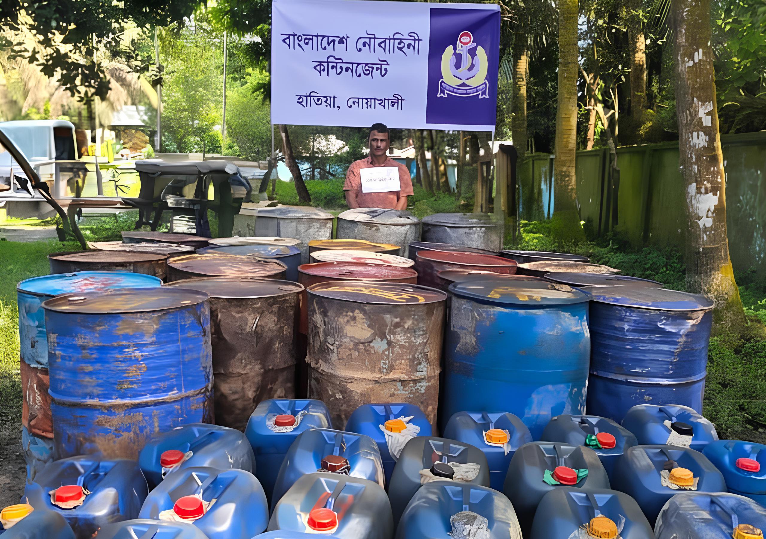 সংবাদ বিজ্ঞপ্তিতে জানা যায়, বাংলাদেশ নৌবাহিনী দায়িত্ব¡পূর্ণ এলাকা সমুহে মাদক, অস্ত্র, চোরাচালান ও অবৈধ পণ্য পরিবহন রোধসহ আইন-শৃঙ্খলা পরিস্থিতি নিয়ন্ত্রণে নিয়মিত টহল কার্যক্রম পরিচালনা করে আসছে। এরই ধারাবাহিকতায় গত শনিবার দিবাগত রাতে নৌবাহিনীর একটি টহল দল হাতিয়া উপজেলার নলচিরা ঘাট এলাকায় টহল চলাকালীন নৌবাহিনীর গাড়ি দেখামাত্র এক ব্যক্তি একটি দোকানের সামনে থেকে দৌড়ে পালিয়ে যায়। বিষয়টি সন্দেহ হওয়ায় নৌবাহিনী উক্ত দোকানে তল্লাশি করে বিপুল পরিমাণ অবৈধ তেলসহ বেলাল নামে একজন চোরাচালানকারীকে আটক করা হয়।