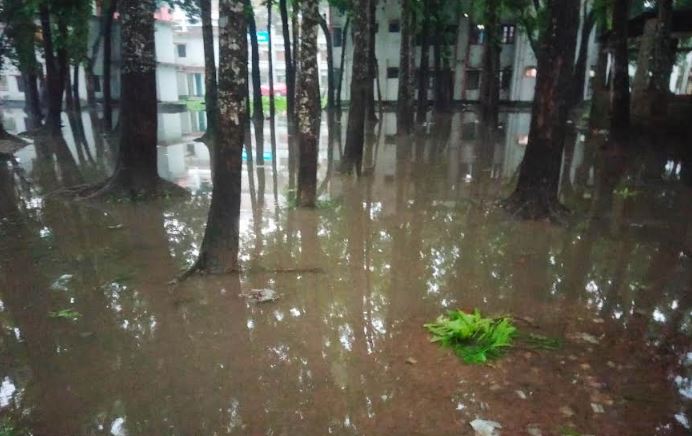 রোববার সকালে হওয়া স্বল্পমাত্রার বৃষ্টিতেই ক্যাম্পাসের বিভিন্ন স্থানে হাঁটুসমান পানি জমে যায়। বিশেষ করে গাছপালা ঘেরা এলাকা ও নিচু স্থানগুলোতে পানি দীর্ঘ সময় ধরে স্থির থাকায় পরিবেশ অস্বাস্থ্যকর হয়ে উঠেছে। স্থানীয়দের অভিযোগ, দীর্ঘদিন ধরে ড্রেনেজ ব্যবস্থার অব্যবস্থাপনা এবং নিয়মিত পরিষ্কার-পরিচ্ছন্নতার অভাবের কারণেই এ জলাবদ্ধতা সৃষ্টি হচ্ছে। সামান্য বৃষ্টিতেই পানি জমে থাকলেও সংশ্লিষ্ট কর্তৃপক্ষ কার্যকর কোনো পদক্ষেপ নিচ্ছে না। ক্যাম্পাসে আগত কয়েকজন সেবা প্রত্যাশি জানান, পানি জমে থাকায় বিভিন্ন দপ্তরে কাজ করতে তাদের সমস্যায় পড়তে হচ্ছে। অনেক সময় জুতা হাতে নিয়ে কাদা পানির মধ্যে দিয়ে চলাচল করতে হয়। বিগত সময়ে প্রায় ৭৫ হাজার টাকা ব্যায় করে পাই লাইনের ব্যবস্থা করা হলেও কার্যত তা এখন অচল প্রায়। এ বিষয়ে সংশ্লিষ্ট প্রশাসনের পক্ষ থেকে এখনো পর্যন্ত কোনো বক্তব্য পাওয়া যায়নি। তবে এলাকাবাসী দ্রæত ড্রেনেজ ব্যবস্থা উন্নয়ন ও নিয়মিত রক্ষণাবেক্ষণের দাবি জানিয়েছেন, যাতে ভবিষ্যতে এ ধরনের দুর্ভোগ থেকে মুক্তি পাওয়া যায়।