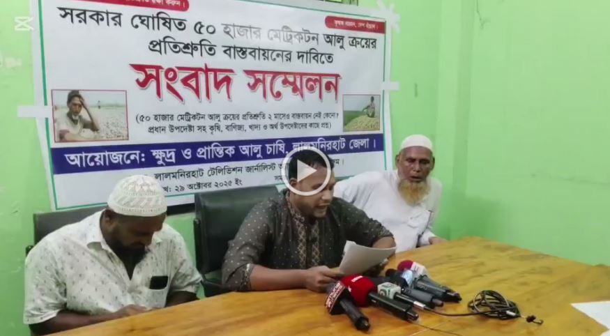 মোস্তাফিজুর রহমান: আলু ক্রয়ের সরকার ঘোষিত প্রতিশ্রুতি দ্রুত বাস্তবায়ন,আলু মজুদের কারণে ৩১শে ডিসেম্বর পর্যন্ত সারাদেশের সকল হিমাগারে কুলিং সিস্টেম চালুর দাবি সহ ৩দফা দাবিতে লালমনিরহাটের সংবাদ সম্মেলন করেছেন ক্ষুদ্র ও প্রান্তিক আলুচাষিরা। বুধবার লালমনিরহাট টেলিভিশন জার্নালিস্ট অ্যাসোসিয়েশন হলরুমে এই সংবাদ সম্মেলন অনুষ্ঠিত হয়। এ সময় কৃষি উদ্যোক্তা ও আলু চাষী লিখন মিয়া তার লিখিত বক্তব্য বলেন, বর্তমান সরকার প্রান্তিক চাষীদের কাছ থেকে ৫০ হাজার মেট্রিক টন আলু ক্রয়ের সিদ্ধান্ত নিয়েছিল। কিন্তু এ পর্যন্ত সরকারের এ কার্যক্রম বাস্তবায়ন হয়নি। ফলে আমরা যারা প্রান্তিক আলুচাষি আছি।সবাই আর্থিকভাবে লোকসানের মুখে রয়েছি। কৃষক বাঁচাতে ও উদ্যোক্তা সৃষ্টিতে প্রধান উপদেষ্টা সহ সংশ্লিষ্ট মন্ত্রণালয়কে ক্ষুদ্র কৃষকদের লোকসানের হাত থেকে রক্ষার্তে অবিলম্বে সরকারের সিদ্ধান্ত অনুযায়ী প্রান্তিক কৃষকদের কাছ থেকে আলু ক্রয়ের দাবি জানাচ্ছি।