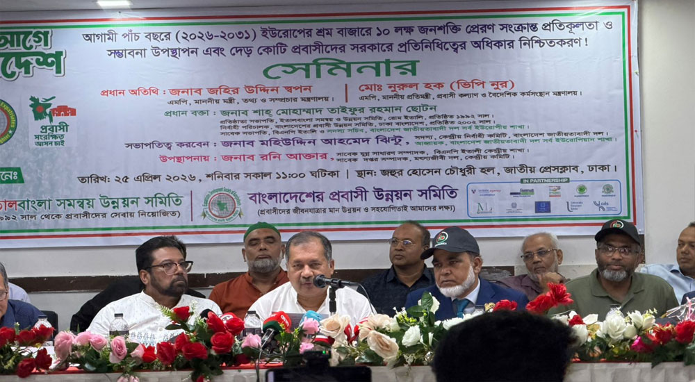 আজ (শনিবার) দুপুরে জাতীয় প্রেসক্লাবের জহুর হোসেন চৌধুরী হলে ‘ইউরোপীয় শ্রমবাজারে ১০ লাখ দক্ষ জনশক্তি: মাস্টারপ্ল্যান (২০২৬-২০৩১) উপস্থাপন এবং প্রবাসীদের রাষ্ট্রীয় অধিকার নিশ্চিতকরণ’ শীর্ষক সেমিনারে প্রধান অতিথির বক্তব্যে তিনি এ কথা বলেন।