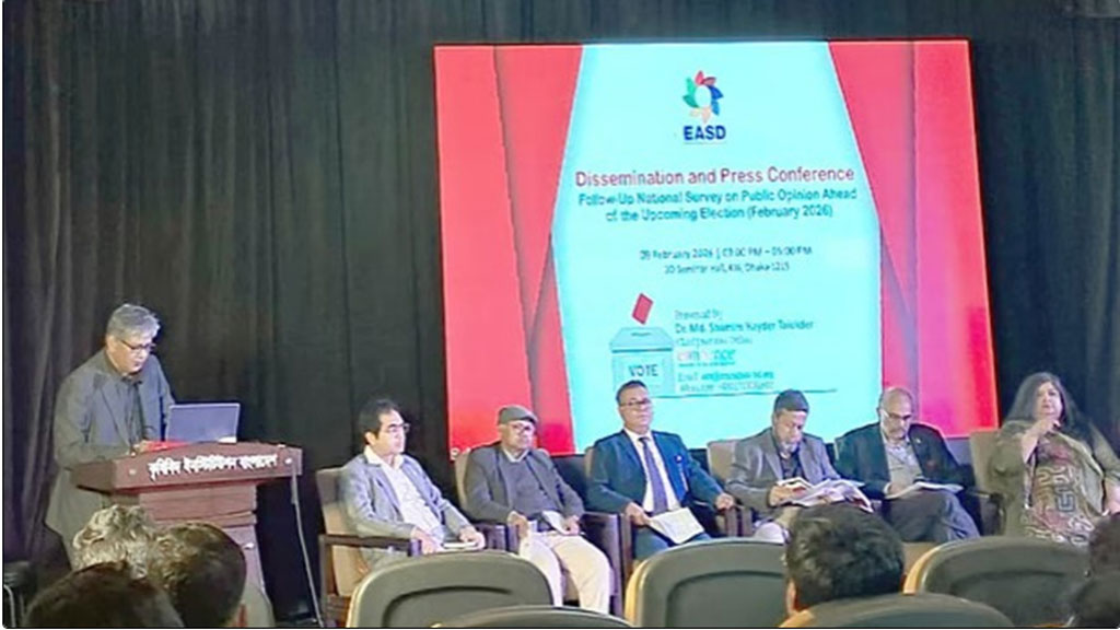 আজ সোমবার বিকেলে রাজধানীর কৃষিবিদ ইনস্টিটিউশনের থ্রিডি সেমিনার হলে ইএএসডির এই জরিপের ফলাফল প্রকাশ করা হয়। ইএএসডির দাবি, এবারের নির্বাচন নিয়ে যতগুলো জরিপ হয়েছে, সেগুলোর মধ্যে তাদের এই জরিপটিই সবচেয়ে বড় নমুনার জরিপ।