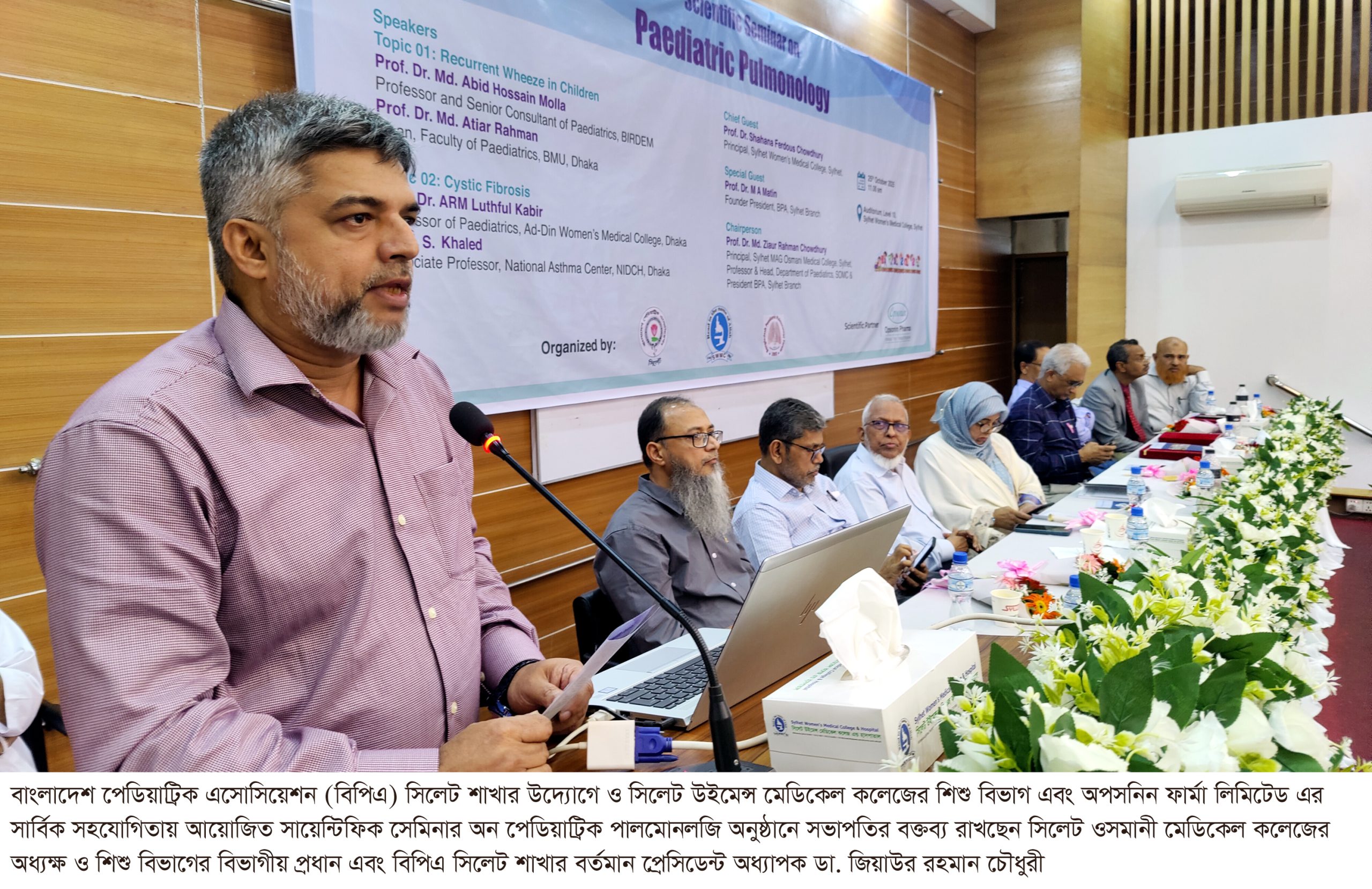 শনিবার (২৫ অক্টোবর) সকালে বাংলাদেশ পেডিয়াট্রিক এসোসিয়েশন (বিপিএ) সিলেট শাখার উদ্যোগে ও সিলেট উইমেন্স মেডিকেল কলেজের শিশু বিভাগের তত্ত্বাবধানে এবং অপসনিন ফার্মা লিমিটেড এর সার্বিক সহযোগিতায় আয়োজিত সায়েন্টিফিক সেমিনার অন পেডিয়াট্রিক পালমোনলজি অনুষ্ঠানে সভাপতির বক্তব্যে তিনি উপরোক্ত কথাগুলো বলেন।
