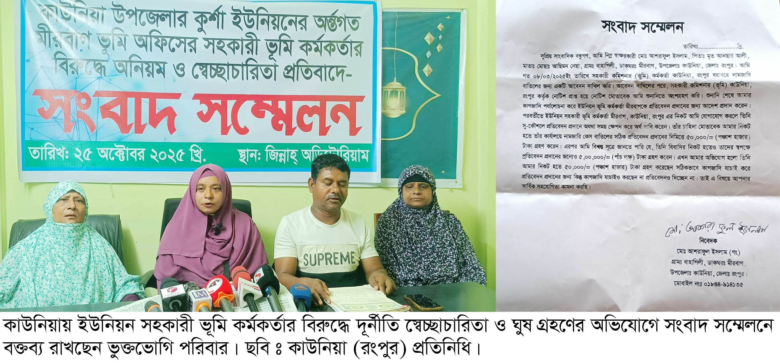 কাউনিয়া (রংপুর) প্রতিনিধি ঃ কাউনিয়া উপজেলার কুর্শা ইউনিয়ন সহকারী ভূমি কর্মকর্তার বিরুদ্ধে দূর্নীতি, স্বেচ্ছাচারিতা ও ৫ লাখ টাকা ঘুষ নিয়ে নামজারী করে দেয়ার প্রতিবাদে শনিবার উপজেলার জিন্নাহ অডিটোরিয়ামে সাংবাদিক সম্মেলন করেছে এক ভুক্তভোগী পরিবার। সাংবাদিক সন্মেলনে লিখিত বক্তব্যে কুর্শা ইউনিয়নের বাহাগিলি গ্রামের মৃত আনছার আলীর পরিবারের ভূক্তভোগী সদস্য রাসনা বেগম বলেন, বিগত কয়েক মাস পূর্বে তাদের নামীও জেএল নং-৩০, আরএস ২১, খতিয়ান নং ২০, ৪৫০, নামজারি ৬৫২, দাগ নং ১৭১৪, ১৭১২, ১৭১১ ও ১৭১৪, ১৭১২, ১৭১১ এর ১ একর ২১ শতাংশ এবং আরএস খতিয়ান নং ২১ নামজারি ৭৮৭, দাগ নং ১৭৪২ জমির পরিমান ২৪ শতাংশ। মোট ১ একর ৪৫ শতাংশ জমি স্থানীয় প্রভাবশালী এক ব্যক্তি কৌশলে নামজারী করে নেন। সেই নামজারী বাতিলের জন্য গত ৮ মার্চ ২৫ তারিখে কাউনিয়া উপজেলা সহকারী কমিশনার (ভুমি) এর দপ্তরে আবেদন করেন তারা। ১০ মার্চ ২৫ সহকারী কমিশনার (ভুমি) এর দপ্তর হতে প্রাপ্ত শুনানির নোটিশ পেয়ে সকল অংশিজন হাজির হলে সহকারী কমিশনার (ভুমি) শুনানি শেষে কুর্শা ইউনিয়ন সহকারী ভুমি কর্মকর্তা মিজানুর রহমানকে জমির কাগজ পত্র যাচাই বাছাই করে প্রতিবেদন দেয়ার নির্দেশ প্রদান করেন। প্রতিবেদন প্রদানের নির্দেশ পাওয়ার পর কুর্শা ইউনিয়ন সহকারী ভুমি কর্মকর্তা মিজানুর রহমান কাজ করে দেওয়ার জন্য তাদের নিকট ৫০ হাজার টাকা দাবি করেন। সকল অংশিজন মিলে তাকে ৫০ হাজার টাকা প্রদান করা হয়। এরই মেধ্যে উক্ত সহকারী ভূমি কর্মকর্তা মিজানুর রহমান প্রভাবশালী বিবাদীর পক্ষেও প্রতিবেদন দেয়ার কথা বলে দূর্নীতি, স্বেচ্ছাচারিতা করে ৫ লক্ষ টাকা নিয়েছেন বলে আমরা গোপন সূত্রে জানতে পারি। ফলে তিনি এখনো নামজারী বাতিলের কোন প্রতিবেদন দিচ্ছেন না। সহকারী ভুমি কর্মকর্তা মিজানুর রহমান এর এমন আচরণের হাত থেকে রক্ষা পেতে গত ২০ অক্টোবর ২৫ জেলা প্রশাসক এবং উপজেলা সহকারী কমিশনার (ভুমি) বরাবর লিখিত আবেদন দিয়েও কোন প্রতিকার না পাওয়ায় চিন্তিত হয়ে পড়েছে ওই ভ্ক্তূভোগী পরিবারটি। সংবাদ সম্মেলনে উপস্থিত ছিলেন, ভুক্তভোগী পরিবারের সদস্য আশরাফুল ইসলাম, আনিছা বেগম, আম্বিয়া বেগম প্রমূখ।