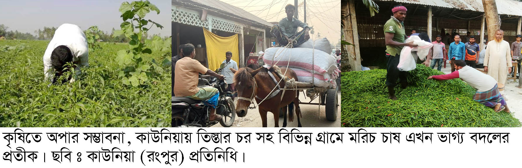সরেজমিনে তিস্তা নদী বেষ্টিত বিভিন্ন গ্রাম ঘুরে দেখা গেছে ইতি মধ্যে কেশ কিছু গ্রাম মরিচের গ্রাম নামে পরিচিতি পেয়েছে। এলাকার চাহিদা মিটিয়ে কাউনিয়ার মরিচ যাচ্ছে রাজধানী ঢাকাসহ দেশের বিভিন্ন জেলায়। ঢুসমারা চর, প্রাণনাথ চর, গোপী ডাঙ্গা, চর গদাই, চর গনাইসহ তিস্তা নদীর জেগে উঠা ২২টি চরে মরিচের বাম্পার ফলন হয়েছে। এ সব চরের চাষীরা আলু, ভুট্টা, গম, রসুন, পিয়াজের পাশাপাশি ব্যাপক ভাবে মরিচ চাষ করেছে। কৃষি বিভাগ সূত্রে জানা গেছে চলতি মৌসুমে মরিচ চাষের লক্ষ্যমাত্রা ধরা হয়েছে ১৮৫ হেক্টর কিন্তু চাষ হয়েছে ২০৫ হেক্টর জমিতে। গত বছরের তুলনায় ২৫ হেক্টর বেশী জমিতে মরিচ চাষ হয়েছে। উৎপাদন লক্ষ্যমাত্রাাধরা হয়েছে ৪৬৩ মেঃটন। তিস্তার চরাঞ্চলে পলি ও উর্বর দোআঁশ মাটিতে এবার মরিচের ব্যাপক ফলন হয়েছে। চরগনাই গ্রামের দুদু মিয়া জামান এ বছর অক্টবর-নভেম্বর ভাদ্র আশ্বিন মাসে এক বিঘা জমিতে ফরিদপুরী জাতের মরিচ চাষ করে ফলন ভাল হয়েছে। প্রথম দিকে প্রতি মণ মরিচ ৪ হাজার টাকা দরে বিক্রি করেছেন। একই কথা জানালেন ঢুসমারা চরের কৃষক তাজুল ইসলাম। রোপনের ৬০ দিনের মধ্যেই মরিচ ফলন ধরা শুরু হয়। তবে জাত পোকা, পচন ধরা জাতীয় রোগ হয়। মরিচ বর্তমানে অর্থকরী ফসল হিসেবে কৃষকের কর্মসংস্থান ও আয় বাড়াতে সাহায্য করছে। স্থানীয় কৃষকরা জানান, রংপুর অঞ্চলে মরিচ সংরক্ষনের জন্য সরকারী বা বে-সরকারী কোন হিমাগার না থাকায় প্রান্তিক চাষীরা বাধ্য হয়েও কম দামে মরিচ বিক্রি করতে বাধ্য হয়। কাউনিয়ায় টেপামধুপুর, তকিপল হাট ও খানসামা হাট মরিচের অন্যতম বড় হাট। তকিপল হাট নদী সংলগ্ন হওয়ায় এখানে প্রচুর মরিচ আসে। হাটে ঢাকা, ফেনী, নোয়াখালীসহ বিভিন্ন জেলা থেকে ব্যাপারীরা কাঁচা মরিচ কিনতে আসেন। কৃষকরা জানান, কাউনিয়ার মরিচের ঝাল বেশি হওয়ায় চাহিদাও বেশি। তকিপল হাটের আড়ৎদার হাফিজার বলেন, প্রতি হাটে প্রায় ১৪০-১৫০ মণ কাঁচা মরিচ বিক্রি হচ্ছে। চরসাব্দী গ্রামের মরিচ চাষি এরশাদুল আলম জানান ২৫ শতক জমিতে সে ১ম তোলায় প্রায় ২০মন মরিচ তুলেছে, এভাবে ৭-৮ বার তোলা যাবে। প্রথমে সে মরিচ ৪হাজার টাকা মন দরে বিক্রি করেছে, বর্তমানে ২৫০০ টাকা দরে বিক্রি হচ্ছে। উপ-সহকারী কৃষি কর্মকর্তারা জানান, কম সার, খরচও কম, লাভ বেশি। তাই চাষিরা মরিচ চাষে আগ্রহী হচ্ছেন। সঠিক মাত্রায় সার ও কীটনাশক ব্যবহারের ফলে এবার ফলন হয়েছে বাম্পার। মরিচে ভাগ্য বদলের চেষ্টা চরাঞ্চলের চাষি তাজুল ইসলাম জানান, তিস্তার চরের মরিচের খ্যাতি রয়েছে দেশজুড়ে। তিস্তার বুকে জেগে ওঠা চরে মরিচ এখন শুধু ফসল নয়, এটি হয়ে উঠেছে চরাঞ্চলের কৃষকদের ভাগ্য বদলের প্রতীক। কৃষি অফিসার কৃষিবিদ তানিয়া আকতার বলেন, এ বছর অনুকুল আবহাওয়া ও কৃষকদের আগ্রহের কারণে ফলন 