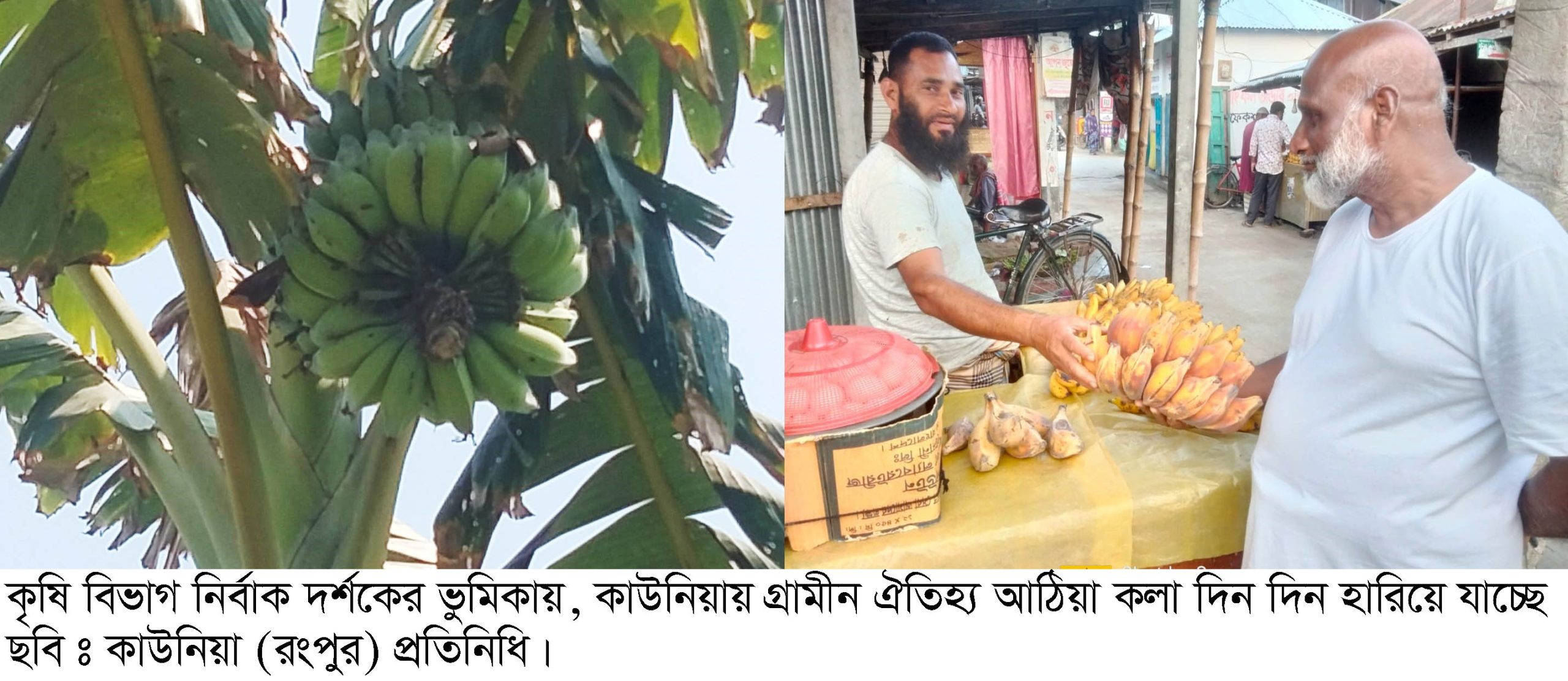 সারওয়ার আলম মুকুল, কাউনিয়া (রংপুর) প্রতিনিধি: কাউনিয়ায় ভিটামিন সমৃদ্ধ গ্রামীন ঐতিহ্য আঠিয়া কলা দিন দিন বিলুপ্তির পথে। আঠিয়া কলা রক্ষায় কৃষি বিভাগ নির্বাক দর্শকের ভুমিকায়। একটা সময় ছিল যখন রংপুরের কাউনিয়ায় প্রতিটি গ্রামে বিশেষ করে গৃহন্থ পরিবার গুলো প্রচুর আঠিয়া কলা চাষ করতেন। অনেকে আবার রাস্তার ধারে এমনিতেই লাগিয়ে রাখতেন। এই কলার চাহিদাও ছিল প্রচুর। আধুনিক পদ্ধতিতে চাষাবাদ শুরুর পর থেকে কৃষি বিভাগরে উদাসিনতায় ধিরে ধিরে গ্রাম বাংলার ঐতিহ্য ভেষজগুণ সমৃদ্ধ আঠিয়া কলা বিলুপ্তির পথে।