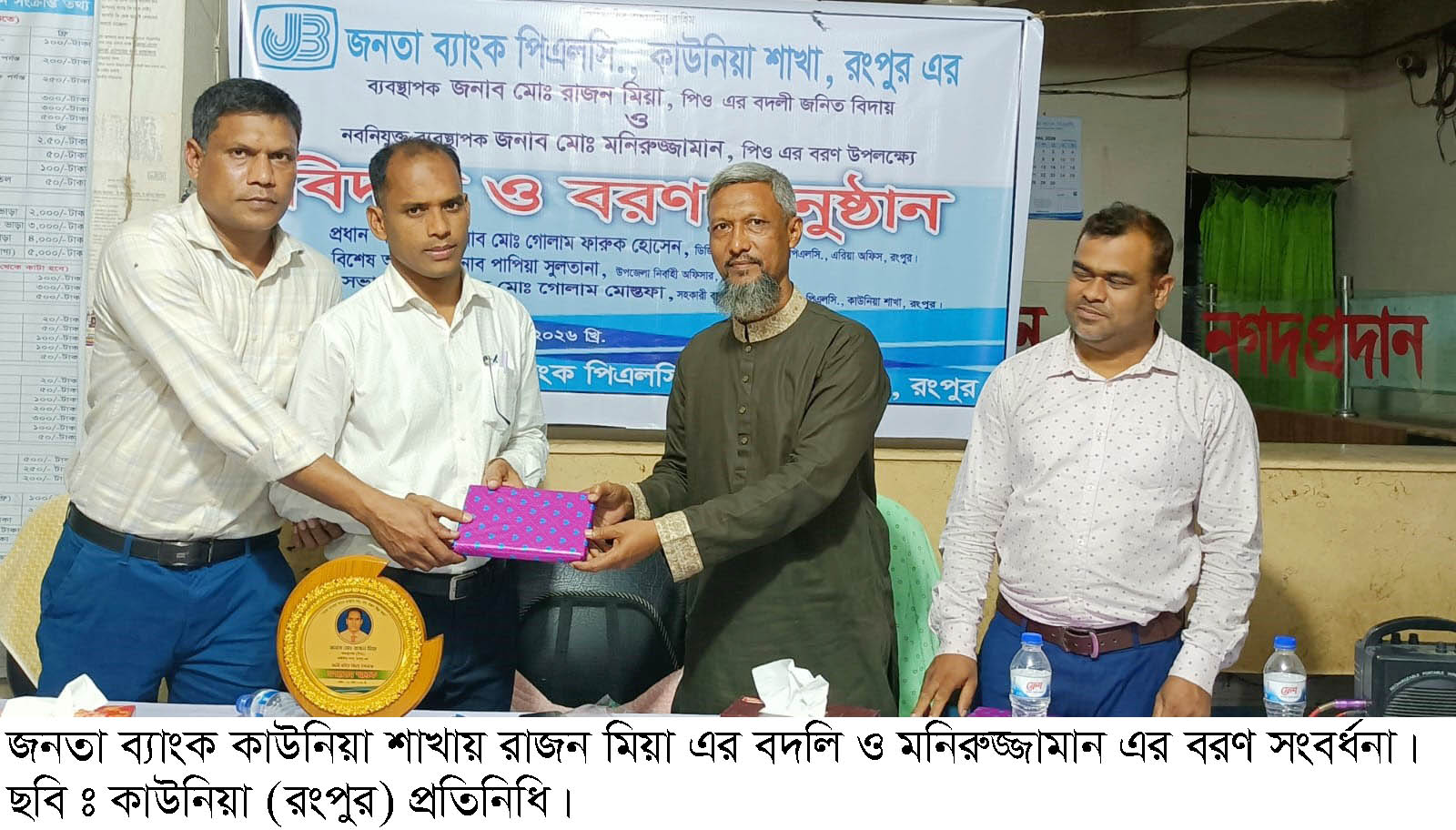 কাউনিয়া (রংপুর) প্রতিনিধি ঃ রংপুরের জনতা ব্যাংক কাউনিয়া শাখার ব্যবস্থাপক মোঃ রাজন মিয়া পিও এর বদলি ও মোঃ মনিরুজ্জামান পিও এর যোগদান উপলক্ষে বিদায় ও বরণ সংবর্ধনা অনুষ্ঠিত হয়। গত বৃহস্পতিবার রাতে বালিকা বিদ্যালয় মোড় জনতা ব্যাংক শাখায় নিজ কার্যালয়ে জনতা ব্যাংক পিএলসি, কাউনিয়া শাখার আয়োজনে জনতা ব্যাংক পিএলসি এর সিনিয়র অফিসার মোঃ গোলাম মোস্তফা এর সভাপতিত্বে ব্যবস্থাপক মোঃ রাজন মিয়া এর বদলি ও মোঃ মনিরুজ্জামান এর যোগদান উপলক্ষে বিদায় ও বরণ সংবর্ধনা অনুষ্ঠান হয়। অনুষ্ঠানটি কোরআন তেলোয়াতের মাধ্যমে শুরু হয় অতিথিদের ফুল দিয়ে বিদায় ও বরণ। বিদায় ও বরণ অনুষ্ঠানে বিশেষ অতিথি হিসেবে বক্তব্য রাখেন ৫নং কাউনিয়া বালাপাড়া বণিক সমবায় সমিতি লিঃ এর সম্পাদক ও প্রত্যাশার আলো পত্রিকার সম্পাদক সারওয়ার আলম মুকুল। উপস্থিত ছিলেন বিশিষ্ট্য ব্যবসায়ী রফিকুল ইসলাম বাগদাদা, জামিল ভুইয়া, মোঃ শফিকুল ইসলাম, রতন সরকারসহ স্থানীয় ব্যবসায়ী, শিক্ষক, সাংবাদিক ও সুধীজন। অনুষ্ঠানটি সঞ্চালনা করেন জুনিয়র অফিসার আবু সাঈদ। আলোচনা শেষে বদলি বা বিদায়ী কর্মকর্তাদের ক্রেস্ট ও বিভিন্ন উপহার সামগ্রী প্রদান করা হয়।