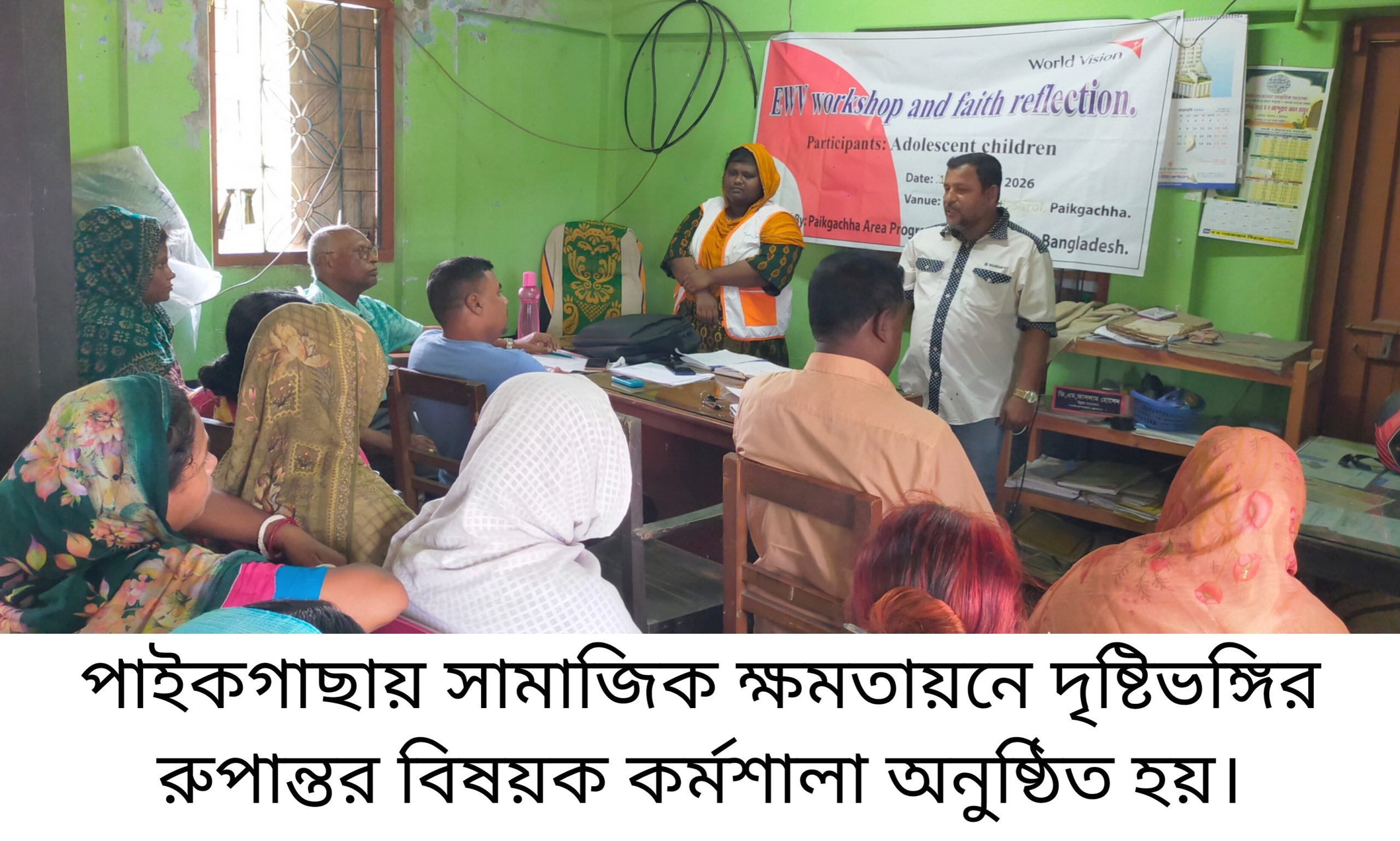 পাইকগাছা (খুলনা) প্রতিনিধিঃ পাইকগাছায় সামাজিক ক্ষমতায়নে দৃষ্টিভঙ্গির রুপান্তর বিষয়ক কর্মশালা অনুষ্ঠিত হয়েছে। ১১ এপ্রিল শনিবার সকালে উপজেলা সদরের আরিফা মার্কেটে বেসরকারি উন্নয়ন সংস্থা ওয়ার্ল্ড ভিষণ বাংলাদেশ এ কর্মশালার আয়োজন করে। ওয়ার্ল্ড ভিষণের সুমাইয়া ইয়াসমিন ও নব ব্যানার্জির সঞ্চালনায় অনুষ্ঠিত কর্মশালায় উপস্থিত ছিলেন প্রাক্তন অধ্যাপক রমেন্দ্র নাথ সরকার, প্রাক্তন শিক্ষক জিন্নাতুন্নেছা পান্না, সাবেক কমিশনার ফাতেমা খাতুন, প্রেসক্লাবের সহ সভাপতি মোঃ আব্দুল আজিজ, আনন্দ মন্ডল, খোরশেদ আলম, শেখ জুলি, শিবাস্টিন মাখাল, মারিয়া মাখাল, বিনা রাণী, লিপিকা দাশ, রুপিয়া বেগম, সীমা দাশ, সুদীপ্ত বিশ্বাস, মনা রাণী সানা ও সাবিত্রী বিশ্বাস।