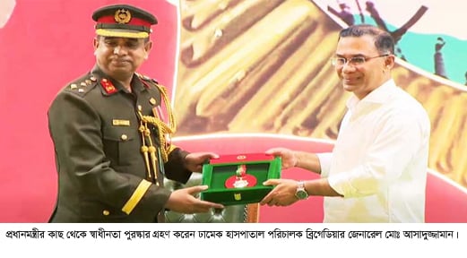 চিকিৎসাবিদ্যায় গৌরবোজ্জ্বল অবদানের স্বীকৃতিস্বরূপ ‘স্বাধীনতা পুরস্কার-২০২৬’ পেয়েছে ঢাকা মেডিকেল কলেজ (ঢামেক) হাসপাতাল। হাসপাতালের পক্ষে প্রতিষ্ঠানটির পরিচালক ব্রিগেডিয়ার জেনারেল মো. আসাদুজ্জামান প্রধানমন্ত্রীর কাছ থেকে এ পুরস্কার গ্রহণ করেন। ব্রিগেডিয়ার জেনারেল মোঃ আসাদুজ্জামান সাতক্ষীরা জেলার তালা উপজেলার তেঁতুলিয়া ইউনিয়নের শিরাশুনী গ্রামের কৃতি সন্তান। তিনি অবসরপ্রাপ্ত শিক্ষক ও তেঁতুলিয়া ইউনিয়নের সাবেক চেয়ারম্যান প্রয়াত আবু তালেব মোড়লের কনিষ্ঠ পুত্র। বৃহস্পতিবার (১৬ এপ্রিল) বিকেলে ওসমানী স্মৃতি মিলনায়তনে আয়োজিত এক অনুষ্ঠানে দেশের ১৫ জন বিশিষ্ট ব্যক্তি ও পাঁচটি প্রতিষ্ঠানকে ‘স্বাধীনতা পুরস্কার-২০২৬’ প্রদান করা হয়। অনুষ্ঠানে প্রধান অতিথি হিসেবে প্রধানমন্ত্রী তারেক রহমান এ পদক তুলে দেন। জাতীয় পর্যায়ে গৌরবোজ্জ্বল ও কৃতিত্বপূর্ণ অবদানের স্বীকৃতিস্বরূপ এ পুরস্কার প্রদান করা হয়।