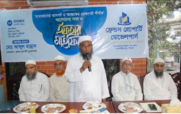 ফ্রেন্ডস প্রোপার্টি ডেভেলপার্স-এর চেয়ারম্যান মোঃ আব্দুল হান্নানের সভাপতিত্বে ও ব্যবস্থাপনা পরিচালক হাফিজ মাওলানা শিব্বির আহমদ এর পরিচালনায় ইফতার মাহফিলপূর্ব আলোচনা সভায় প্রধান অতিথির বক্তব্য রাখেন সিলেট-৫ (কানাইঘাট-জকিগঞ্জ) আসনের নবনির্বাচিত মাননীয় সংসদ সদস্য মুফতি মোহাম্মদ আবুল হাসান। বক্তব্য রাখেন ফ্রেন্ডস প্রোপার্টি ডেভেলপার্সের ভাইস চেয়ারম্যান মাওলানা রওনক আহমদ, নির্বাহী পরিচালক হাফেজ মাওলানা তাজুল ইসলাম হাসান, নির্বাহী পরিচালক মাওলানা শাহ আশিকুর রহমান, কোম্পানির পরিচালক আব্দুল হান্নান তাপাদার, খেলাফত মজলিস সিলেট জেলা সহ-সভাপতি মাওলানা মুখলিসুর রহমান, এডভোকেট মাশহুদ আহমদ চৌধুরী মুহসিন, সিলেট সুপ্রিম কোর্টের আইনজীবী এডভোকেট মোহাম্মদ ফজর আলী, গোলাপগঞ্জ উপজেলার সাবেক ভাইস চেয়ারম্যান হুমায়ুন ইসলাম কামাল, মাউন্ট এডোরা হসপিটালের ও ফ্রেন্ডস প্রোপার্টি ডেভেলপার্স এর পরিচালক ডা. শাহিদ আহমদ,কোম্পানির অর্থ পরিচালক মাসুদ আহমদ প্রমুখ। এছাড়াও ইফতার মাহফিলে বিভিন্ন শ্রেণি-পেশার মানুষ অংশগ্রহণ করেন।
