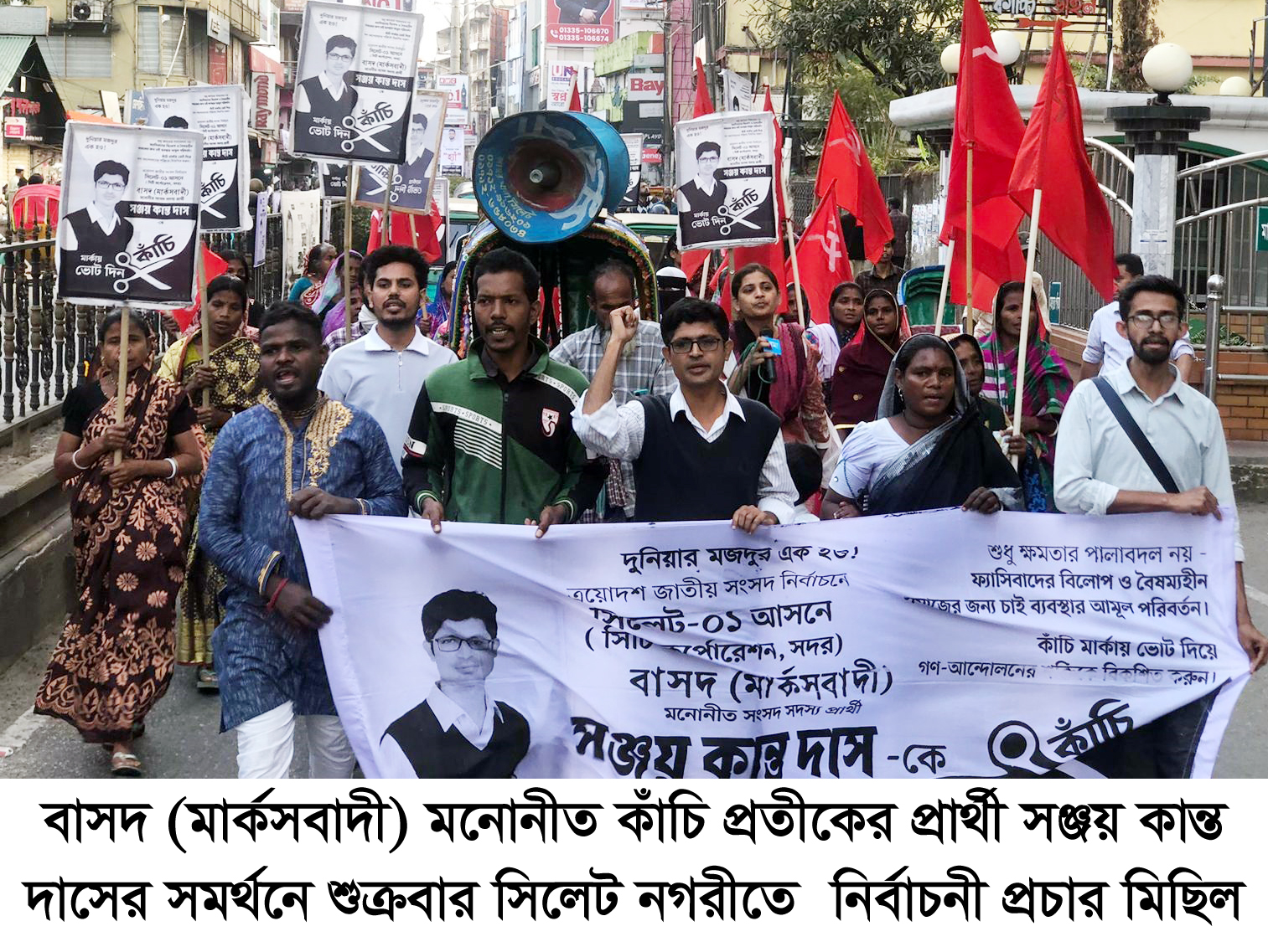 বাসদ (মার্কসবাদী) মনোনীত কাঁচি প্রতীকের প্রার্থী সঞ্জয় কান্ত দাসের সমর্থনে নির্বাচনী প্রচার মিছিল অনুষ্ঠিত হয়। শুক্রবার (৬ ফেব্রুয়ারী) বিকাল ৪টায় মিছিলটি সিলেট রেজিষ্টারি মাঠ থেকে শুরু হয়ে নগরীর বিভিন্ন গুরুত্বপূর্ণ সড়ক প্রদক্ষিণ করে চৌহাট্টা পয়েন্টে এসে সংক্ষিপ্ত সমাবেশে মিলিত হয়।