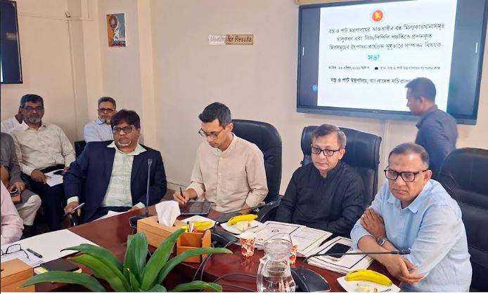 এর আগে বস্ত্র ও পাট মন্ত্রণালয়ের সভাকক্ষে বন্ধ জুট মিল, কারখানা চালুকরণ ও ইজারা সংক্রান্ত স্টেকহোল্ডারদের সঙ্গে জরুরি সভা অনুষ্ঠিত হয়।সভায় বস্ত্র ও পাট প্রতিমন্ত্রী শরীফুল আলম, বিডার চেয়ারম্যান আশিক চৌধুরী, মন্ত্রণালয়ের সচিবসহ বিটিএমসি’র ঊর্ধ্বতন কর্মকর্তাসহ সংশ্লিষ্ট কর্মকর্তারা উপস্থিত ছিলেন।