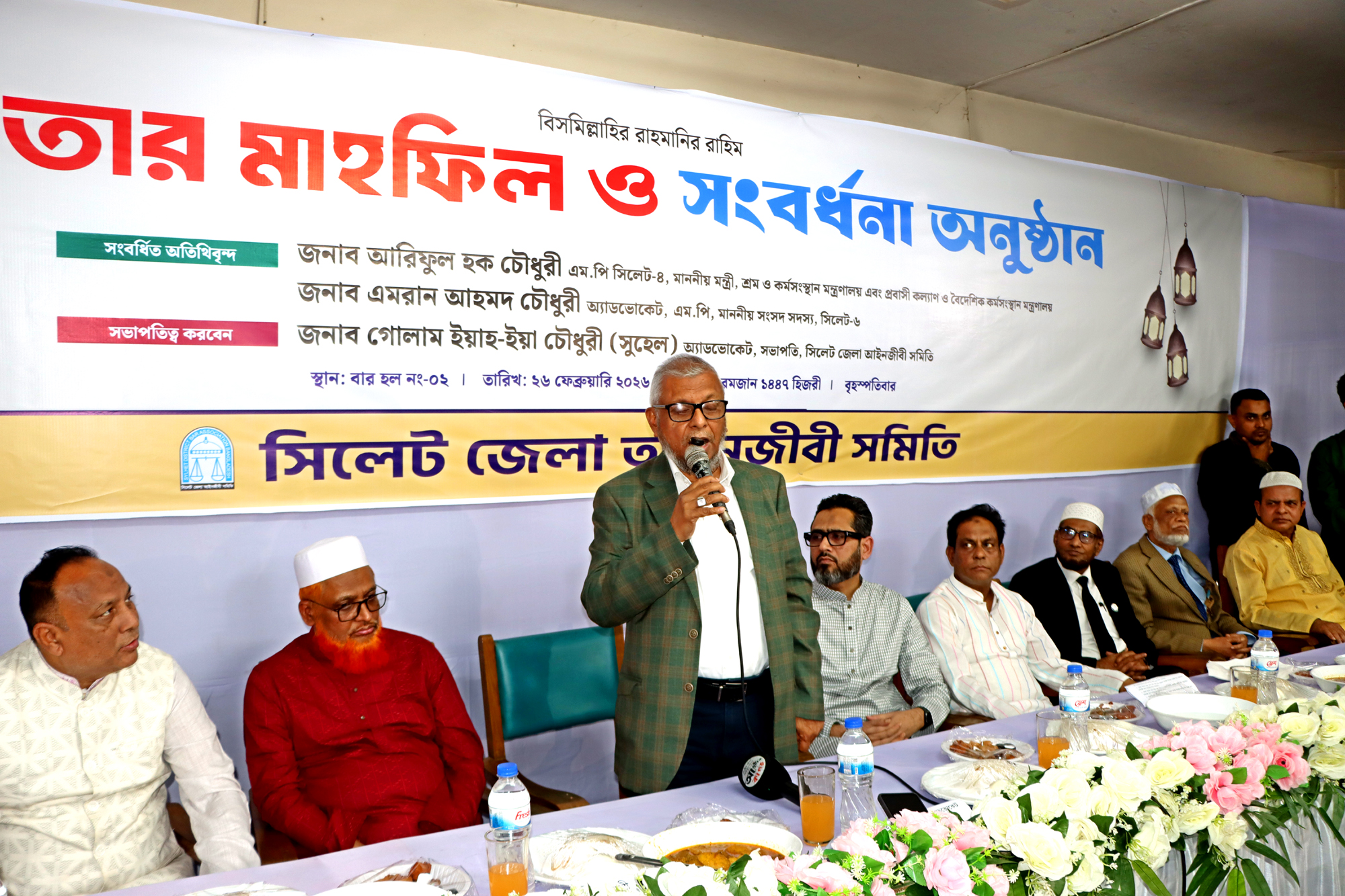 বৃহস্পতিবার (২৬ ফেব্রæয়ারী) সিলেট জেলা আইনজীবী সমিতির বার্ষিক বাজেট সাধারণ সভা, ইফতার মাহফিল ও সংবর্ধনা অনুষ্ঠানে সংবর্ধিত অতিথির বক্তব্যে মন্ত্রী আরিফুল হক চৌধুরী উপরোক্ত কথাগুলো বলেন। সিলেট জেলা আইনজীবী সমিতির সভাপতি অ্যাডভোকেট গোলাম ইয়াহ-ইয়া চৌধুরী (সুহেল) এর সভাপতিত্বে এবং যুগ্ম সম্পাদক-১ অ্যাডভোকেট মো. আব্দুল মুকিত (অপি) ও যুগ্ম সম্পাদক-২ অ্যাডভোকেট মো. হেদায়েত হোসেন তানবীরের যৌথ সঞ্চালনায় আয়োজিত অনুষ্ঠানে সংবর্ধিত অতিথি হিসেবে উপস্থিত ছিলেন সিলেট জেলা আইনজীবী সমিতির সদস্য সিলেট-৬ আসনের সংসদ সদস্য অ্যাডভোকেট এমরান আহমদ চৌধুরী।