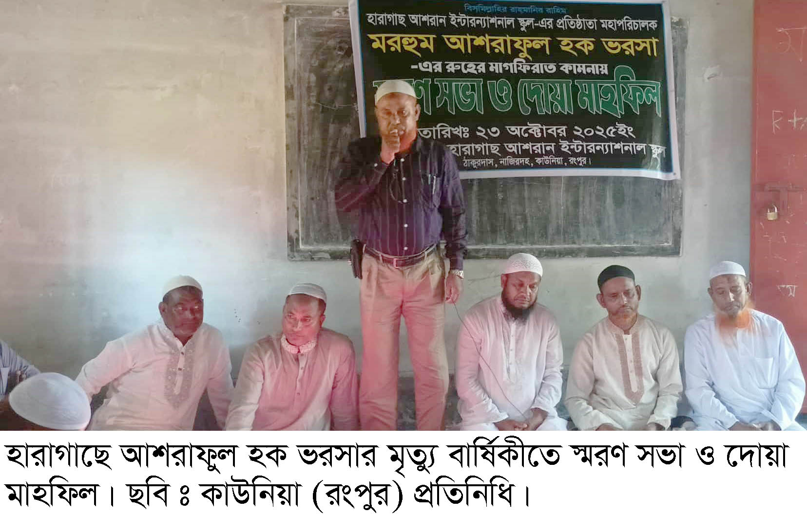 কাউনিয়া (রংপুর) প্রতিনিধি ঃ হারাগাছ আশরান ইন্টারন্যাশনাল স্কুলের প্রতিষ্ঠাতা মহাপরিচালক আশরাফুল হক ভরসার মৃত্যু বার্ষিকীতে স্মরণ সভা ও দোয়া মাহফিল বৃহস্পতিবার অনুষ্ঠিত হয়েছে। স্কুল হল রুমে স্কুলের পরিচালক এআরএম মুজিবুর রহমানের সভাপতিত্বে স্মরণ সভা ও দোয়া মাহফিলে বক্তব্য রাখেন হারাগাছ ইউপি চেয়ারম্যান মোঃ রাজু আহমেদ, স্কুলের সহকারী পরিচালক এসএম রব জুপিটার, আব্দুল কুদ্দুছ বসুনিয়া, শিক্ষা সচিব আনোয়ারুল ইসলাম, সহকারী শিক্ষা সচিব আলমগীর হোসেন, অর্থ সচিব শফিকুল ইসলাম, প্রধান শিক্ষক মশিয়ার রহমান বসুনিয়া প্রমূখ। স্বরণ সভা শেষে মরহুমের রুহের মাগফেরাত কামনা করে দোয়া মাহফিল অনুষ্ঠিত হয়। সভায় সুধী, অভিভাবক ও শিক্ষার্থীরা উপস্থিত ছিলেন।